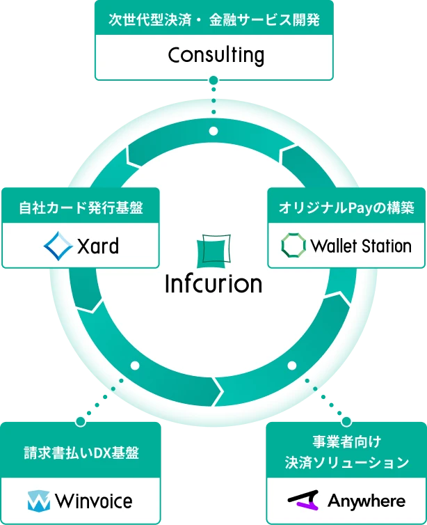インフキュリオンは、キャッシュレス決済や企業間決済、金融機関・公共を支える基盤まで、あらゆる決済・金融サービスを実現する次世代型決済インフラを提供。金融・決済領域の豊富なコンサルティング実績と知見をもとに、事業の革新から新規事業の創出まで包括的に支援しています。