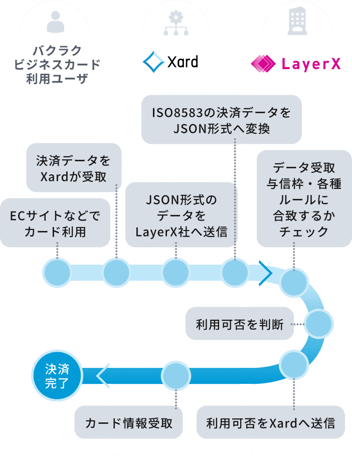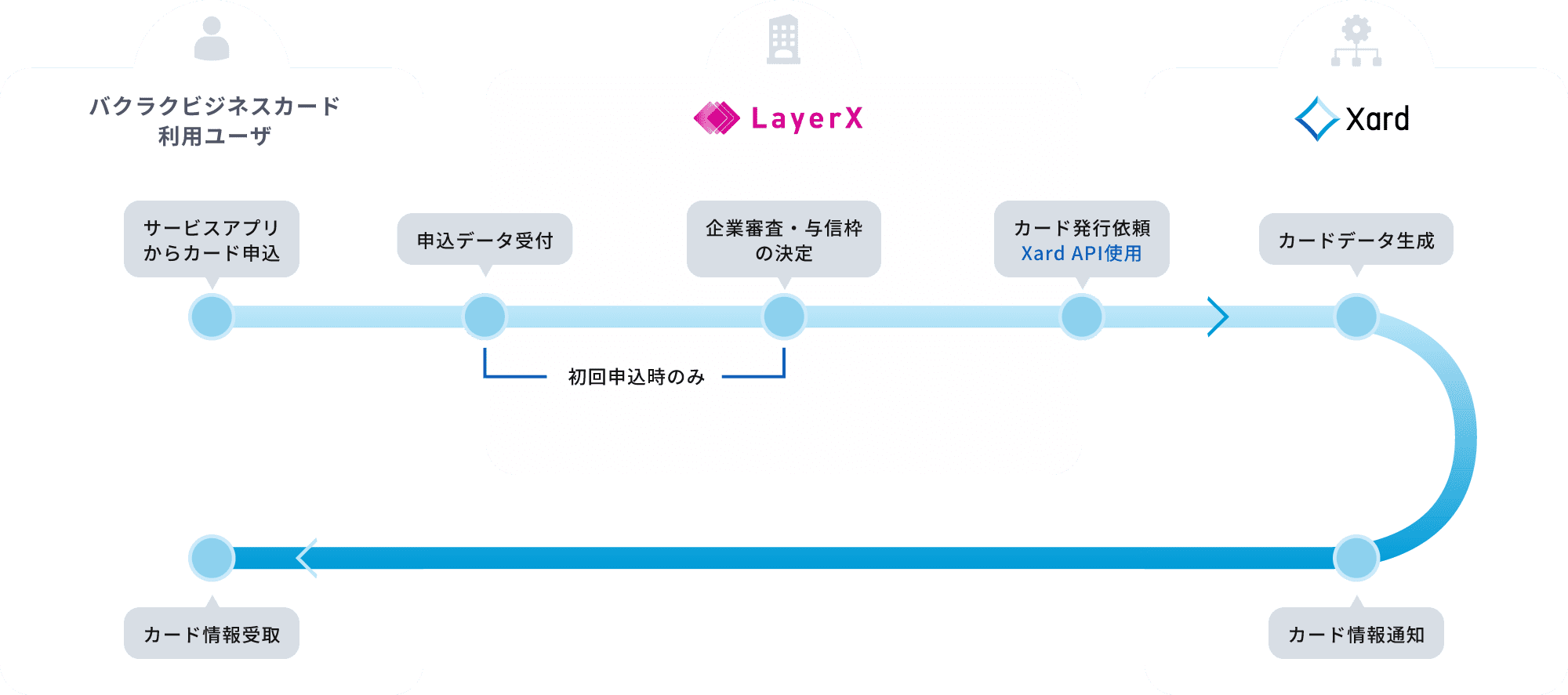 「バクラクビジネスカード 」は、 カード利用における経理担当者の前後の業務も”ラク”になる次世代の法人カード。 柔軟な与信枠が特徴で、カード発行数に制限がなく、 Web上で即時に追加発行することができます。 カード毎の上限額設定や申請・承認機能で内部統制を図り、 利用明細をリアルタイム連携することで証憑管理も効率化。 Xardはカード発行におけるプロセシングシステムとして採用されています。
